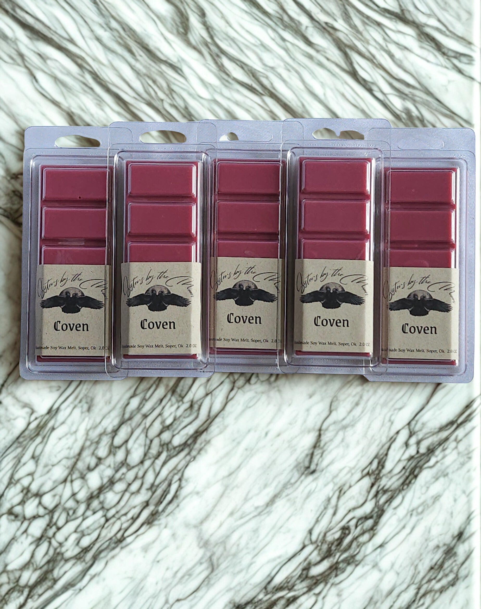 Ignite the senses and cast your intentions with our signature Coven wax melts. This bewitching and mysterious fragrance is crafted to honor the sacred circle and the bonds forged under the moonlight. The scent opens with a whisper of jasmine and a breath of fresh ozone, drawing you into a heart of grounding sandalwood, worn leather, and potent patchouli, notes that have long been revered in magical practices. The aroma deepens into a powerful base of rich amber and powerful musk, anchoring your space in an aura of ancient strength and shared purpose. Let the essence of the coven fill your home and connect you to the magic within.